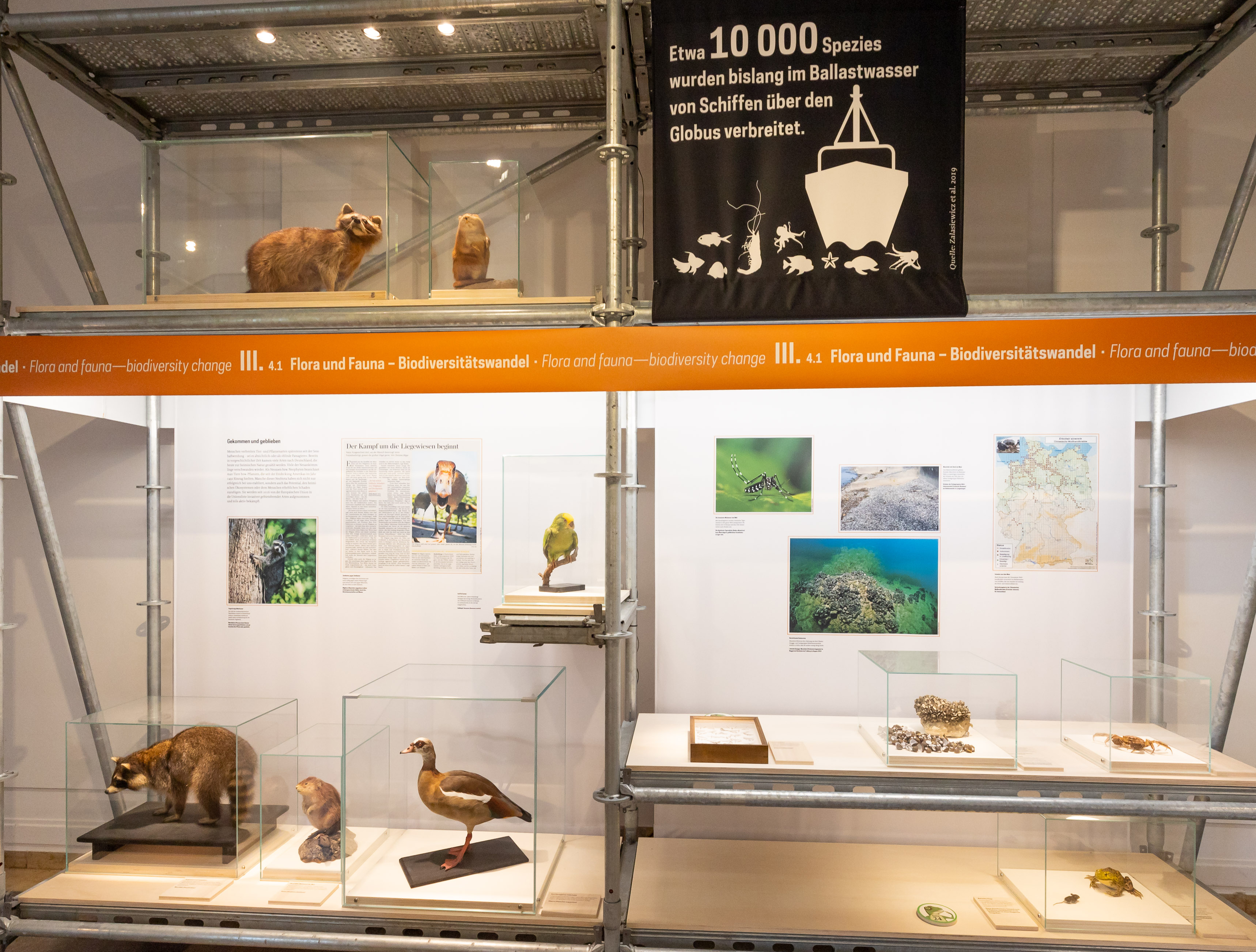 „Wo wir stehen“ lautet dann die Überschrift des umfangreichsten Ausstellungsteiles. Dort zeigen Forschungsergebnisse aus allen Fachbereichen des Naturkundemuseums Stuttgart, Beiträge von Forschungseinrichtungen aus aller Welt sowie harte Fakten und plakative Abbildungen, welche Folgen unser Handeln hat. Von der Überprägung der Landschaft über Umweltverschmutzung und Klimawandel spannt sich der Bogen bis hin zu den Folgen für Flora und Fauna. Konkrete Beispiele aus der Region werden dabei mit globalen Entwicklungen verzahnt, abstrakte Szenarien mit konkreten Erfahrungen verbunden. Zahlreiche spannende Exponate aus den Sammlungen des Museums illustrieren dabei die neuesten Forschungen zu anthropogenen Einflüssen auf die Lebenswelt unseres Planeten.